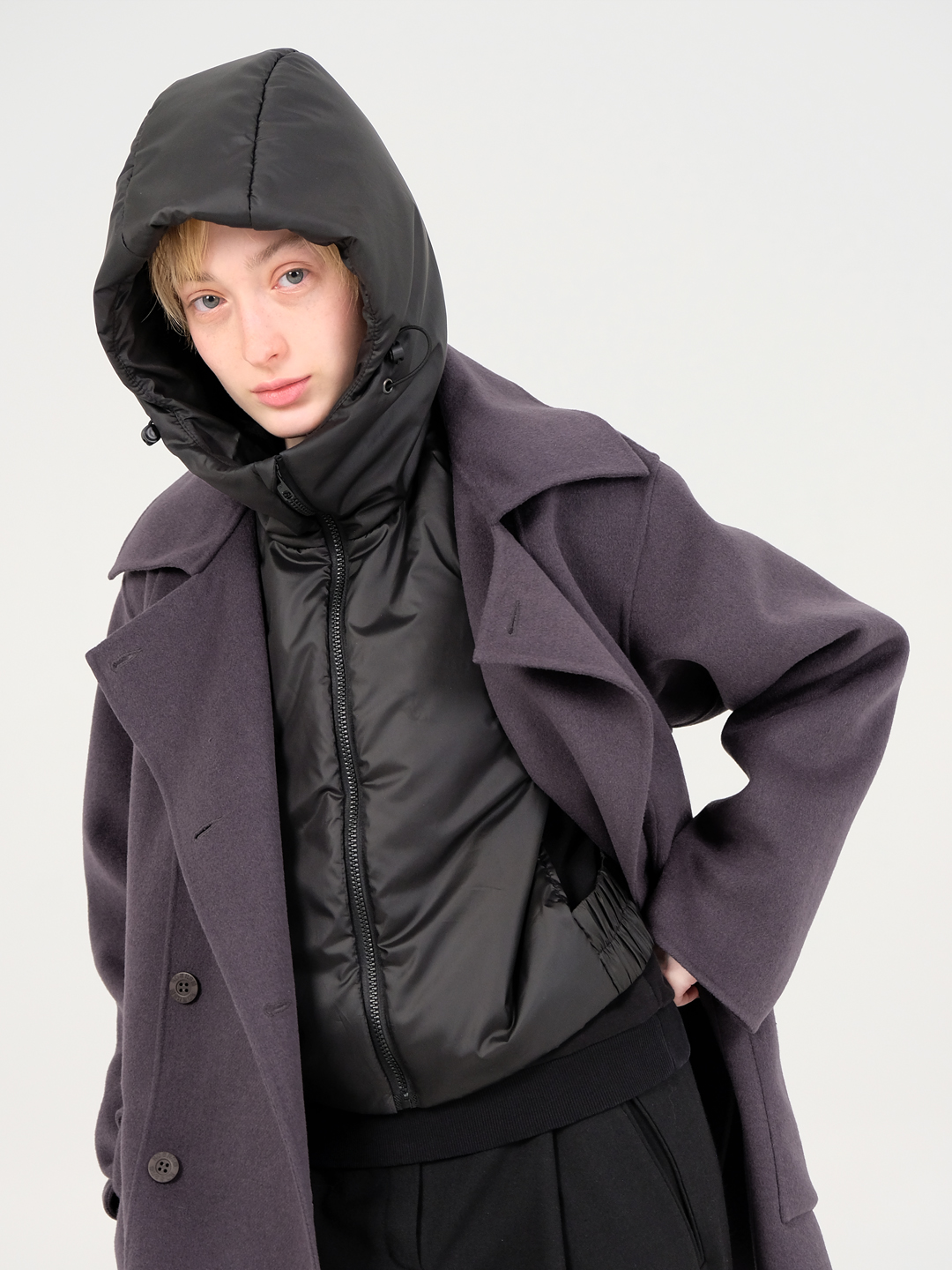 Он сочетается с любой верхней одеждой будь то пуховик, тренч, классическое пальто с запахом или объемная куртка. Конструкция, в которой отсутствует пройма, позволяет надеть этот жилет поверх любого, даже очень объемного, свитера или худи, и совершенно не стесняет движения.